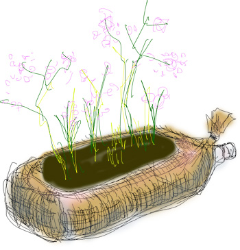 店からの帰り際、定食屋の軒先に、2Lペットボトルを使ったプランターが多数並べられているのを見つけた。ペットボトルを使ったプランターは、よく見かけるが、この店のものはひと工夫加えてあって、荒い麻布のようなものを下図のようにくるりと巻き付けてあった。自分には、確実に、素人の荒さが不思議と面白いというタイプのクラフトアイテムに惹かれる嗜好がある。ただ「そちら系」だけでは、だめなのも分かっていて、例えば、沖縄で見た象設計の「今帰仁村中央公民館」などは、随所に、そういうラフなアイテムが大量に見受けられたにも関わらず、ある強烈な強さが感じられたなと良く思い出す…。