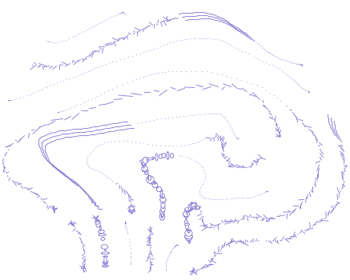 ③そのように、手と眼が分離した状態になったら、今度は、手が自動的に生成していく線の中から、「街並みに見えるような部分」とか「人の顔のように見える部分」とか、あるいは「何となく面白い形になっている部分」とかを発見していく。手はひたすら生成を続け、眼がその膨大なスタディの中から、何かをセレクトしていく。生物の進化と淘汰のように、作業をする。