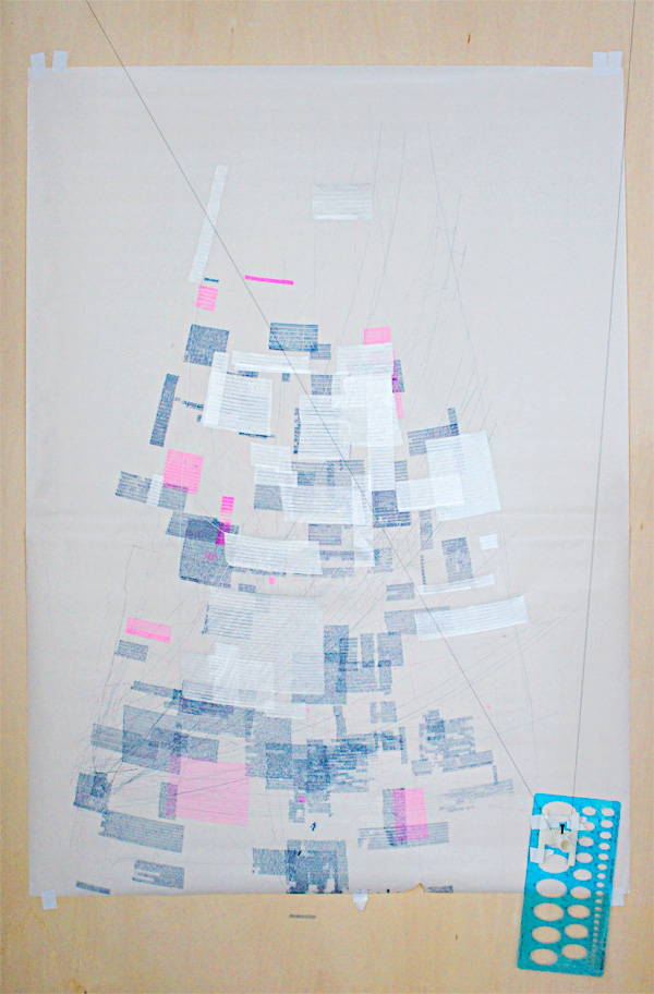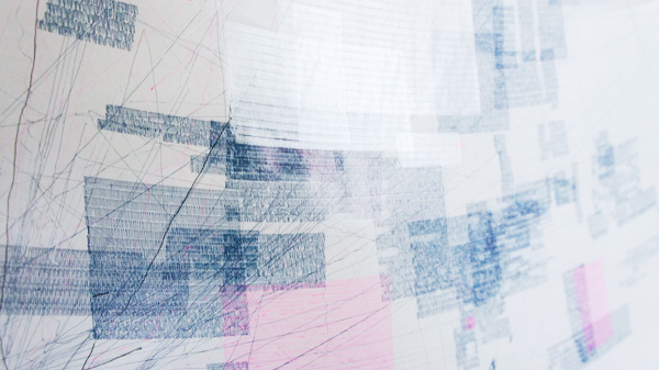 ただ大きさの違う四角を、ランダムに分散させながら描き続けるだけという単純な仕組みだが、予期しないボールペンのかすれや、モーターの脱調(空回りすること)などによって、面白い表情が生まれた。プログラムを試行錯誤する過程で、紙の上を這いずり回ったボールペンの軌跡が良い感じのノイズになったと思う。