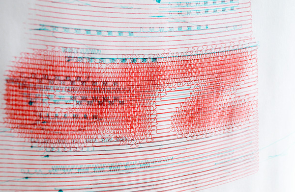 ちなみにこの絵は、夜、寝る前に機械を走らせ、朝起きたら止めるというのを3晩ほど繰り返した結果、生まれたもの。普段わりと忙しく、疲れて帰ってきて一刻も早く寝たいけれども、絵を描いてみたいという自分の代わりに、夜通し、機械が動いてくれている。自分は仕組みを考える抽象思考を担当し、キカイのほうに労働を担当してもらうという、産業では当たり前の作業分担でやっている。だいたいこんな感じの絵になるだろうと思って、眠りにつき、朝、起きると、意外と予想から外れた表現になっているケースが多く、面白い。このキカイが、ただ慌ただしく仕事に行く準備をするためだけの時間だった朝に、わずかながらでもそういう楽しみを与えてくれ続けると良いと思う。またすぐ飽きてしまうのかもしれないが…。