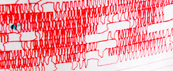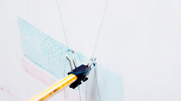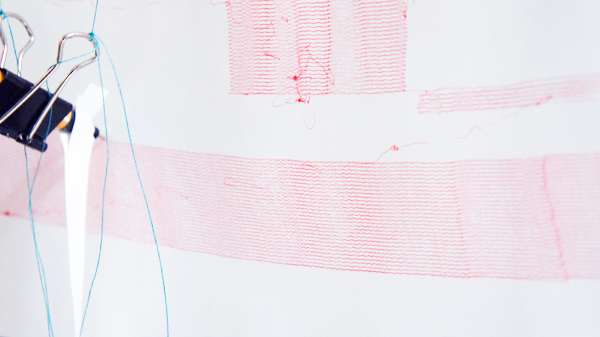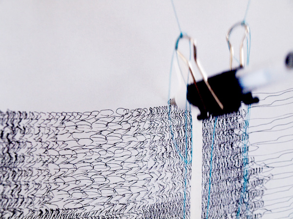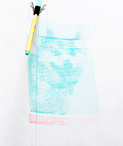 ハードウェアの構築、プログラミングなど、若干の試行錯誤ののち、装置は完成し、ジジジ…と虫のような鈍いモータ音をさせながら、ゆっくりと動きはじめた。2点で支持されたペンは非常に不安定で、小刻みに波打ちながら、不思議な筆圧の線をのこしていった。今にも切れそうな、普通のミシン用の手芸糸で吊っているせいか、不安をさそう挙動だったが、印象とは裏腹に、線はとても正確に、1本ずつ等間隔にひかれ、2時間弱の時間をかけて、犬の画像を描ききった。。。