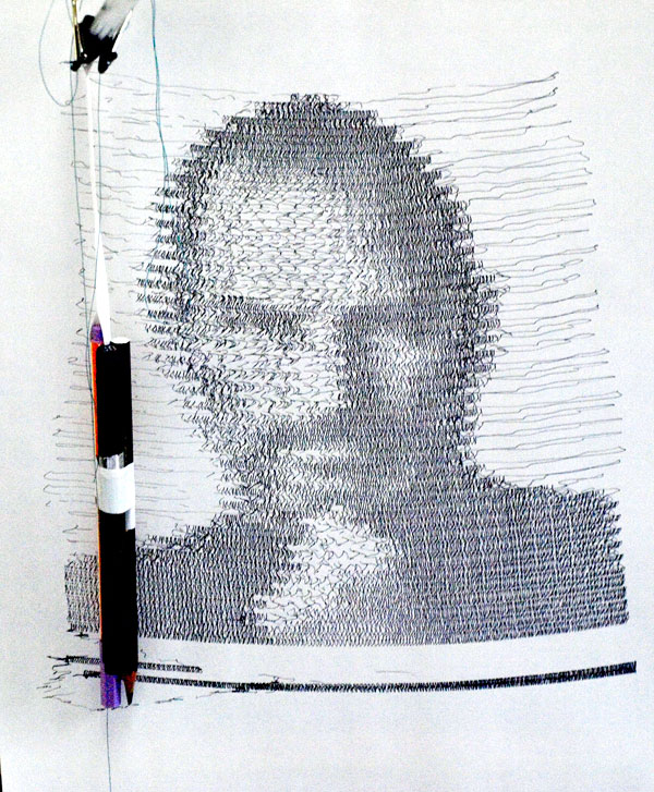 いまは、ただ単に、画像データを読み込ませて、それを描いているだけだが、何らかの抽象的な線画を自動で描くような仕組みにしたい。最終的に、絵としての強度のある図像を作れるかどうかは分からないが…。モーターのスピードの制御によって、スピーディなタッチから、しっかりとした落ち着きのあるタッチまで、ある程度の線の表情の描き分けが出来るような気がするので、もう少し研究したい。