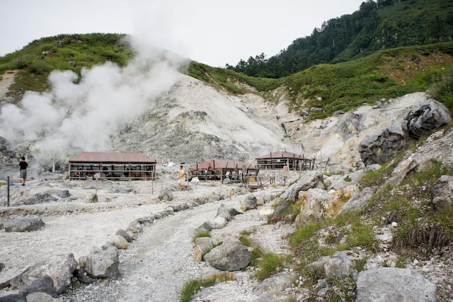 その後、玉川温泉に無事到着。ここは岩盤浴が非常に有名な温泉地らしく、地熱により熱せられた岩の上に、粗末なバラックが2,3建てられており、その中でたくさんの人が寝ころんでいた。皆、自分のマットやゴザなどを持参してきていたが、自分たちはそういうものを持っていなかったので、岩の上にしばらく腰掛けただけだったが、一応、体験した気になった。ここは岩盤浴だけでなく、通常の、湯につかるタイプの温泉もあった。ラジウム温泉と書いてあったので、放射能を帯びた湯だったようだ。後に調べたところによると、被曝量は15-20ミリシーベルト/年との事。