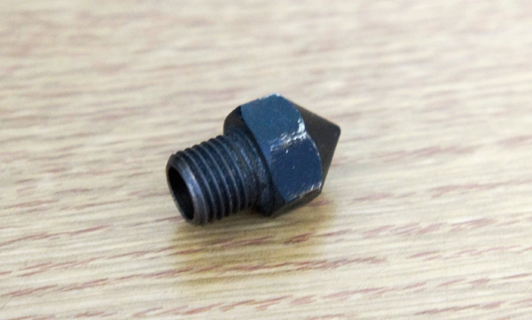 組み立ててからしばらく経っている、3DプリンタThing-O-Maticだが、早くも重要な部品をひとつダメにしてしてしまい、現在使用不能な状態になってしまっている。重要な部品とは、プラスチックフィラメントを射出するノズルのヘッド部分で、ヘッドの温度を上げすぎたことにより、内部でプラスチックが焦げ付き、射出口をつまらせてしまった。