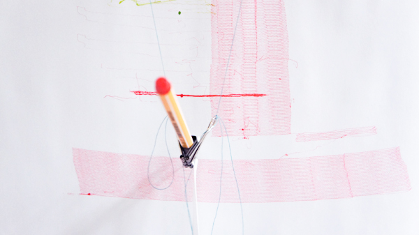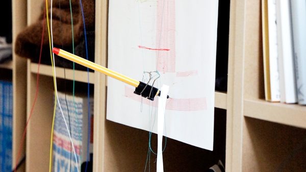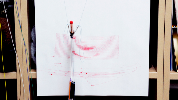 二本の糸で吊り下げられたペンをモーター制御し、絵を描く機械を作ってみた。このような仕組み自体は、昔から色々な人が製作しているのだが、勉強のために、自分でも作ってみた。自動で描かれる絵というものに何故だか惹かれてしまう。何がそんなに面白く感じられるのか、突き詰めるには、先人の模倣であっても、自分でもやってみるほか無いように感じられた…。