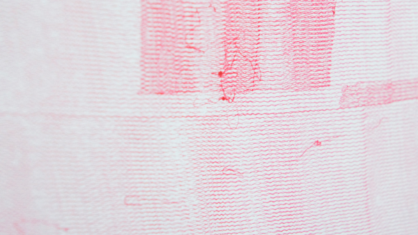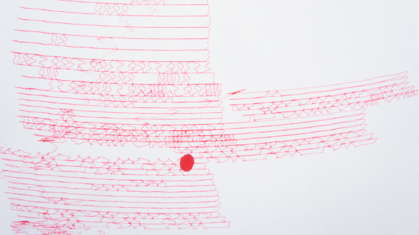 ただ大きさの違う四角を、ランダムに分散させながら描き続けるだけという単純な仕組みだが、予期しないボールペンのかすれや、モーターの脱調(空回りすること)などによって、面白い表情が生まれた。プログラムを試行錯誤する過程で、紙の上を這いずり回ったボールペンの軌跡が良い感じのノイズになったと思う。