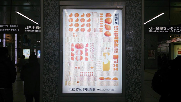 先日、帰省した際に浜松駅で見かけた静岡新聞のポスター。以前にも見たので、もうずいぶん前から貼ってあると思うが、新聞記事風のレイアウトが全てみかんで再現されている…。