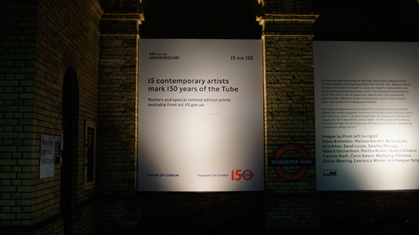 地下鉄のGroucester road駅でポスターの展示を見る。ロンドン交通局の活動のひとつでArt on the undergroundという、地下鉄駅構内で現代美術の展示を定期的に行っている活動があり、今回の展示もそのひとつ。ロンドン地下鉄150周年を記念したもののようだ。
