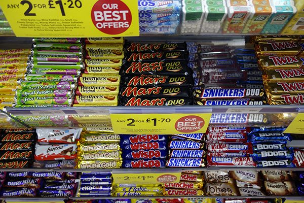 駅の売店のチョコバー売り場。通常の2倍のサイズのDUOというシリーズがある。レベルが高そうなのでまだ手を出していない。
