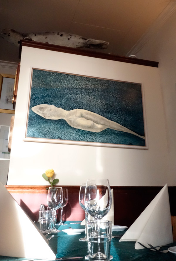 _DSC8973その後、シーフードがおいしいというレストランに入り、夕食を食べた。自分はクジラのステーキを食べた。何かに似ている味がしたが、何に似ているのか分からなかった。味はしっかりしていて、とてもおいしかった。W氏のオーダーしたグラタンも少し分けてもらったがこれもおいしかった。店内にはアザラシやカニの剥製、宇宙のように星降る海に横たわる、大王イカらしき白い物体を描いた絵などがあった。W氏の地元、千葉のイタリア料理屋の内装に似ているという。。
