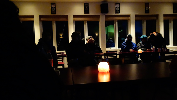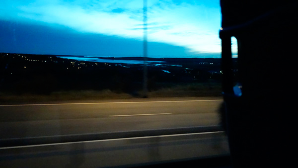 実は今日のメイン行程は夜にあり、事前に申し込んであったNothern Lightツアー(オーロラ観測ツアー)に出発した。夜8時過ぎ、徐々に日が沈み、外が青く暗くなっていく中を、オーロラ観測スポットまでバスで移動した。バス内は中高年が多かった。ガイドさんが、このバスには世界十数カ国からの参加者が乗っていると言っていた。