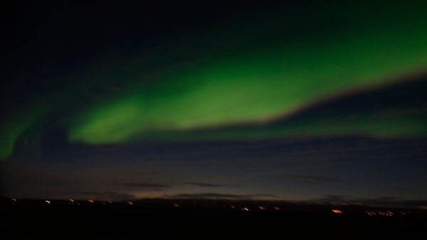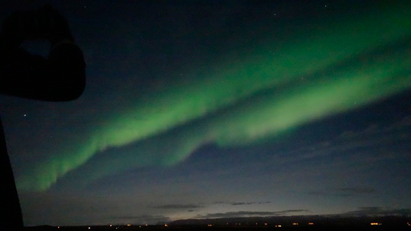 その後、ガイド氏が現れ、既にノーザンライトが見えていると言って空を指差した。白いモヤが見えていて、雲だと思っていたものが実は光だったらしかった。微妙な見え方だったため、ちょっと想像していたものと違うなと思っていたら、徐々にその雲のようなモヤが濃くなり始め、ある時、はっきりと、空にカーテンがかかったように光る巨大な帯がかかった。これは想像以上にきれいで、あまりに滑らかな出現方法と、スケール感の大きさに、やや意識が持って行かれるような感じがした。写真では肉眼で捉えられない波長を拾うので、強い緑色に発行しているが、実際はもっと薄く淡く、白い光だった。