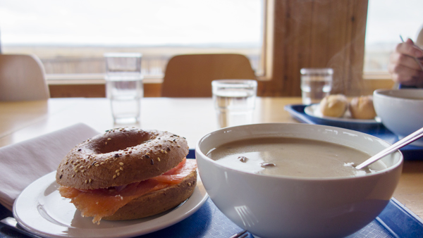 休憩所で昼食をとる。サーモンベーグルと何らかのキノコのはいったクリームスープを食べた。キノコのスープが非常に美味だった。