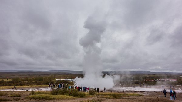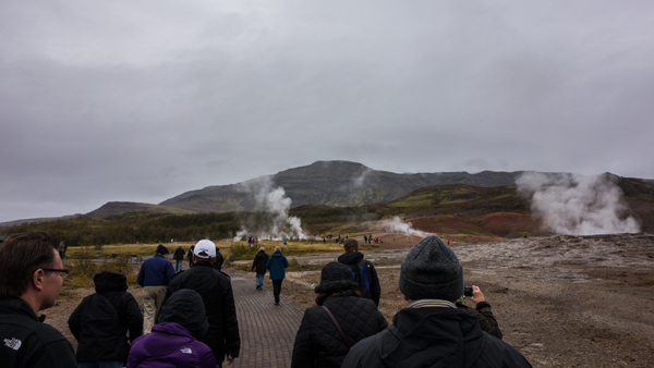 Geysirという、熱湯が地表から吹き出すところに到着。日本で言うところの地獄谷、および間欠泉のたぐいのもの。10分間隔くらいで、20メートル近く湯柱が吹き出す穴があり、皆でそこに群がってシャッターチャンスを狙っていた。熱湯がバスンと音を立てて吹き出す瞬間は妙に気持ちのよい感じで、面白く、何度か見いった。日本だと確実に温泉卵が売っている環境だが、さすがに無かった。硫黄のにおいがあたり一面に立ちこめていた。