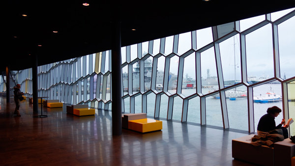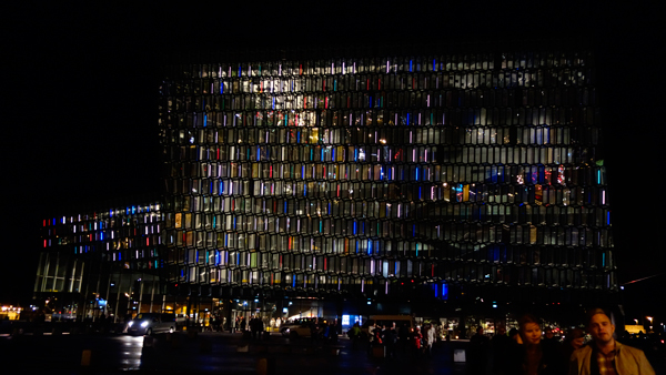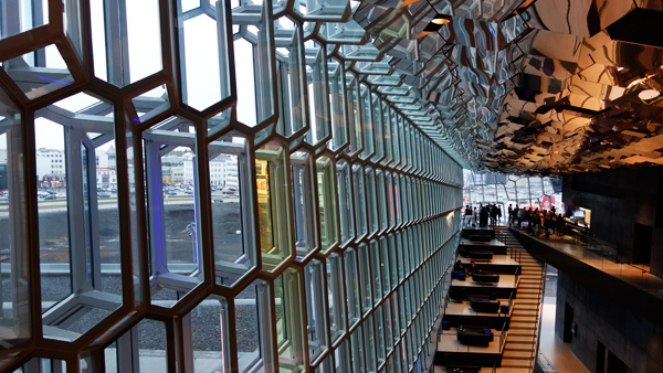 夜はHarpaという近年、出来たコンサートホールに行く。今年度の欧州最優秀現代建築賞(ミース・ファン・デル・ローエ賞)を受賞したという建物で、ヘニング・ラーセン・アーキテクツと、美術家のオラファー・エリアソンの協業による設計。鱗のような外壁にホログラム箔のようなものが貼ってあって、チラチラときれいに光っていた。