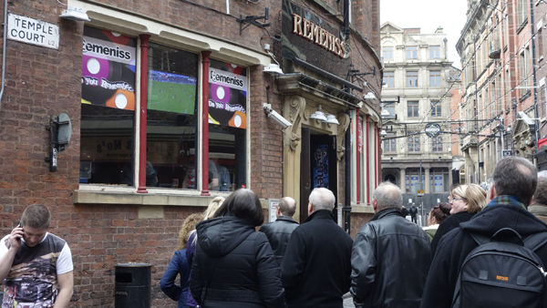 マシュー・ストリート。ビートルズが演奏していたキャバーンクラブ等がある。今日はサッカーの試合があったらしく、多くの人が路上で奇声を発していた。