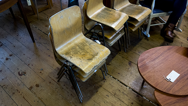 子供用の椅子。おそらく幼稚園などの学校系施設で使われていたものではないかと推測する。どこか他でも同じようなものを見たことがある気がする。鉄パイプを一回まげて、溶接しただけの工業的な足が悪くない。ひとつ12ポンドから15ポンドくらいで、安い気がした。