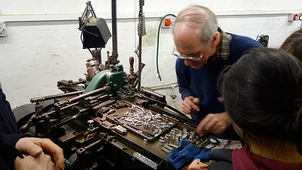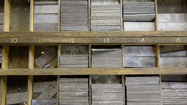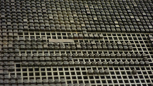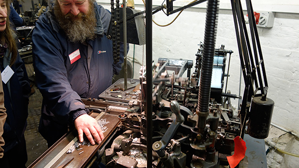 小さな工場の中に数多くの印刷機、活字の鋳造機、活字の母型を掘り起こす際に使われる器具、金属活字、紙板などが高密度で置かれており、活字の鋳造の実演もなされていた。こうした印刷機などは、凸版印刷の印刷博物館や、横浜の築地活字、またアントワープのプランタン・モレトゥス印刷博物館などに行ったときにも見たことがあったが、ここの空間は、全体的に未整理で生々しい印象があり、いまだにこの工場が稼働中かのような迫力があった。また会場には、見た感じ200人を超す人々が集まっており、全員がとにかく楽しそうに目を見開いて、会場の至る所を捜索し、会話に花を咲かせている熱気もありありと感じられた。