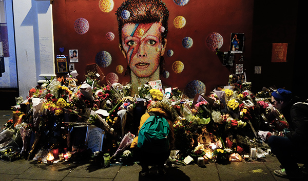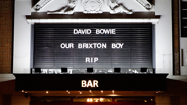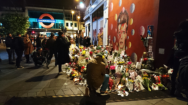 自分も完全にそういう人々の一員で、一夜明けた今日、伝説の人物の死というものについて少し見てみたく、全くファンでも無いにも関わらず、Brixtonに少し立ち寄ってみた。映像で見た昨夜のような群衆の姿はすでに無かったが、駅前の壁画の前で多くの人が写真を撮ったり、隣の壁にメッセージを書き付けたりしていた。自分もそれに紛れて、ひっきりなしに人が訪れては花を添え、しばらく立ち尽くして去っていくのを見ていた。特に何も感じることはなかったが、その後代表曲を聴き漁り、Space Oddityという曲が良いということを知った。