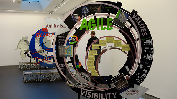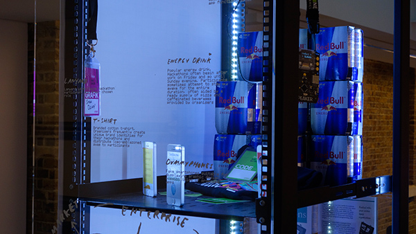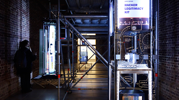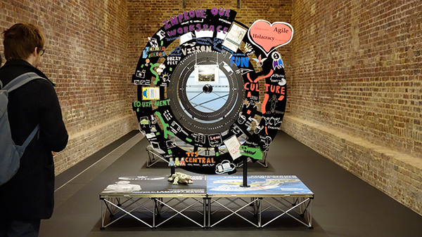 ふたつ目はSIMON DENNYという作家の立体作品の展示で、サーバーラックやLANケーブル、Red Bullなどを使用したものや、シリコンバレー系のテック企業のオフィスレイアウト、ホワイトボードに書かれた殴り書きの矢印、様々なワークスタイル解説本にあるようなダイアグラムなどをコラージュしまくった立体作品などがあった。