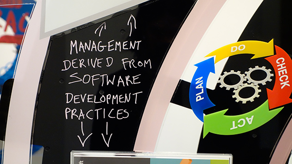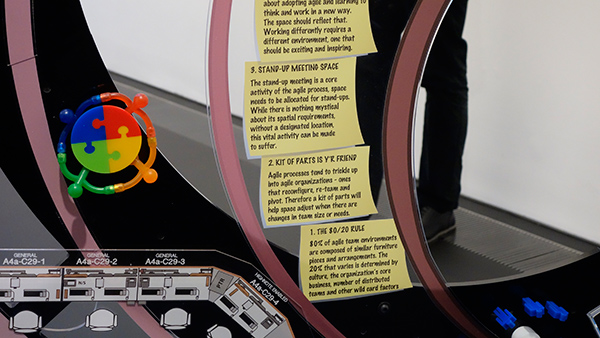 どちらもテクノロジーをモチーフにした作風だった。前者はそこらじゅうのウェブサイトで見かけるようなシンプルなアイコンやフラットデザインのカラー、後者は、大量に立ち並ぶ抽象彫刻のようなサーバーラック、テック系企業の至る所で見かけるポストイットが大量に貼られた壁や、パワーポイントで作成された原色だらけの図表、カジュアルな手書きマーカーなど、現代にいつのまにか生まれてしまった新しい「様式」を目ざとく見つけ、それを芸術の文脈で再提示してみるという試みだったように思えた。どちらも文脈操作による芸術表現なので、ぱっと見で美しくて気持ち良いというようなものはなかったが、面白くはあった。