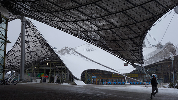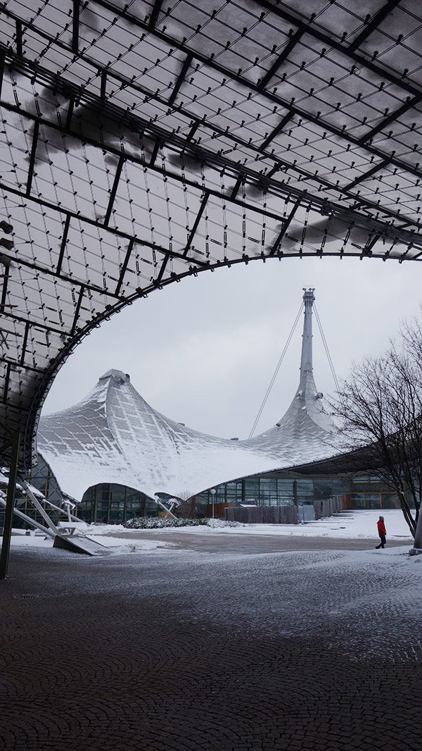 少しだけ自由になる時間があったので、いくつかの建物を見た。前日に偶然、現地に住む建築家の人と少し話をする機会があり、とりあえずフライ・オットーのミュンヘンオリンピックスタジアム群は見ておいたほうが良いとのことだったので、それを見に行った。
