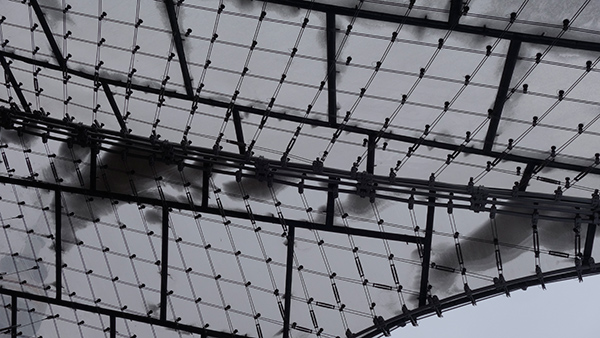 そしてフライ・オットーのスタジアムは、想像していたよりずっと良かった。美しい緊張感でうねるテント屋根がとてもダイナミックに高低差のある大空間を生み出していた。特に、不定形に歪む屋根面や、温室のように透明なガラスで構築された壁面全てに、緻密に細い線材が張り巡らされていて、全てのものが脆くて薄いのに、それらが凍ったように完璧なテンションで静止している感じが素晴らしかった。基本的に、建物というのは静止しているものなのだが、これほど、全てのものが「止まっている」感じがするものはあまりない気がする。一本、骨を折れば全てがはじけそうなきれいな軽さがある。コンクリートで作られたグニャグニャした建物では、この凍結したような印象を出すことは難しいだろうと思う…。