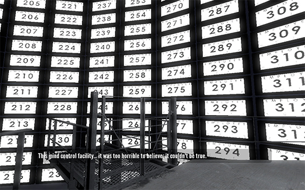 これもThe Beginner’s Guide同様に、基本的には一人称視点のウォーキングゲームなのだが、やはり、ナレーション音声が全編にわたって入っており、「スタンリーは左のドアに入った」とナレーションが入るところで、あえて右側に入るなど、与えられた筋書きと違う行動を取ることで、どんどん破綻をきたしていくストーリーラインを楽しむという趣旨のゲームになっている。プレイヤーが予定通りに進まないと、ナレーターが混乱し始め、最終的にはキレ出して説教のようなものが展開されたり、ストーリ上、最初に見てはいけないものを見てしまったりすると、これはネタバレだ!目をつぶってくれ!と取り乱し始めたりと、バリエーションが幅広い。普通にナレーション通りに操作すると、15分ほどで物語は完結する。